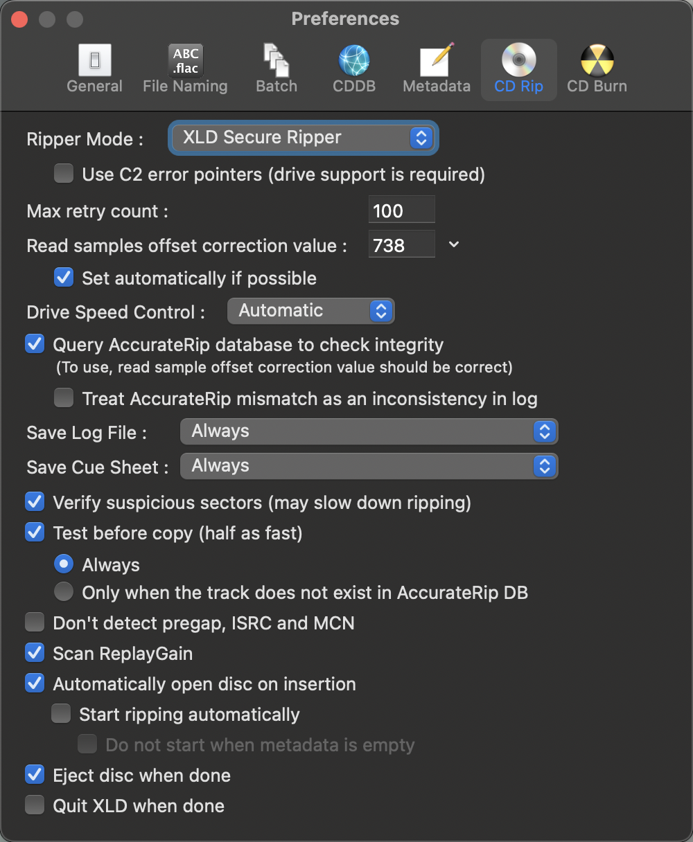 Under the “CD Rip” tab in the Preferences, you’ll find a box that asks whether you want to query the AccurateRip database to confirm authenticity. There is no reason to uncheck it. AccurateRip may or may not confirm whether an album has been ripped properly: there are false negatives from previous poor submissions, false positives (rarely) from identical bad rips, and many, many albums with no data at all. This is why it is best to leave the Treat AR mismatch as an inconsistency… check box in the CD Rip tab in your XLD preferences unchecked.