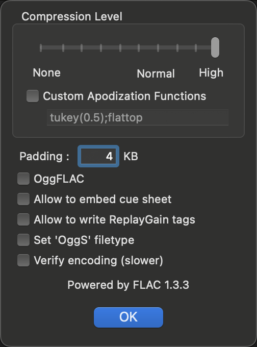 - Click on the Output format drop-down menu, select FLAC, and click the Option button. Drag the Compression Level slider to High, and uncheck “Allow to embed cue sheet”. Then click OK.