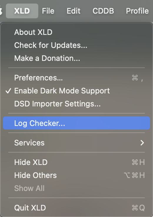 Once installed properly, you will see an option for “Log Checker…” under the XLD menu. You will most likely have to restart XLD for the Log Checker to take effect.